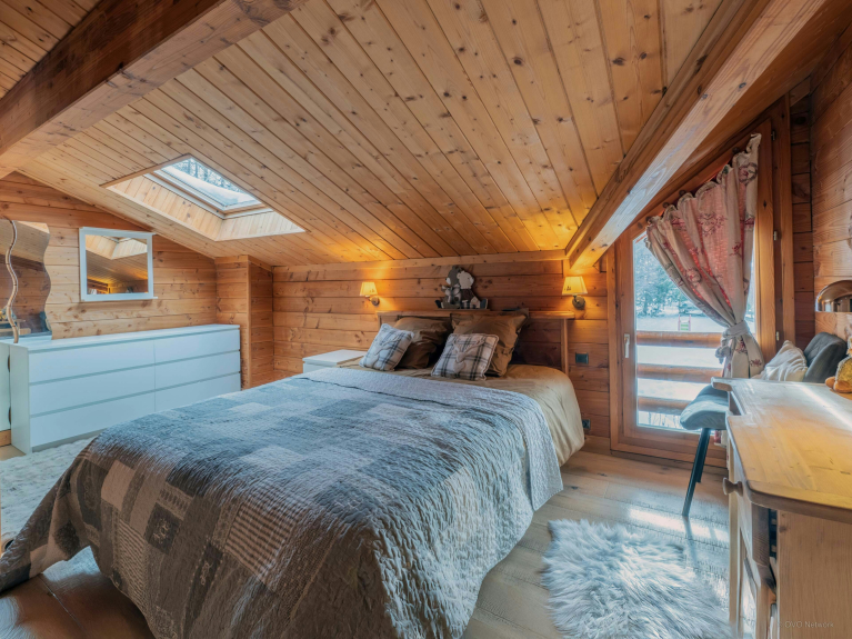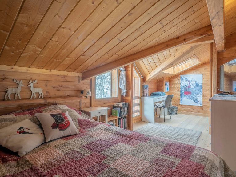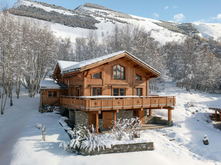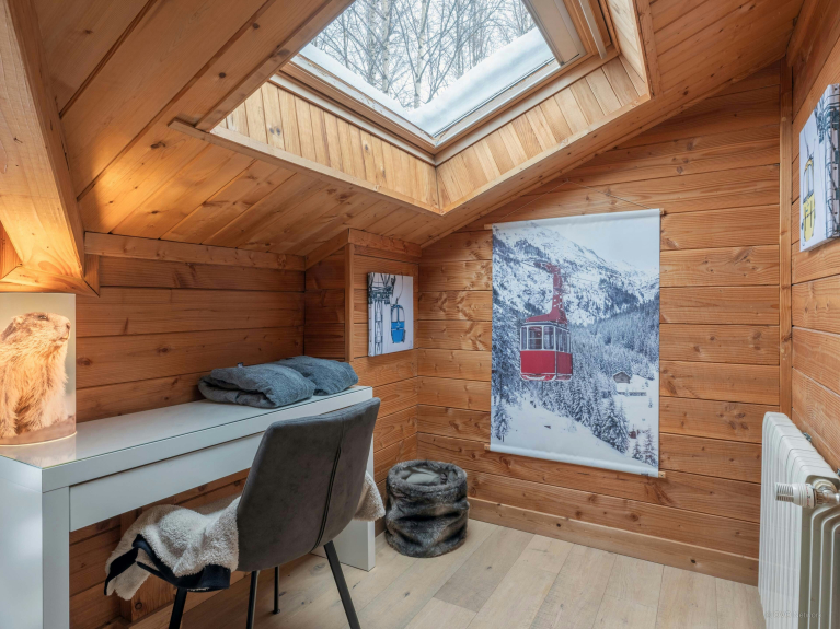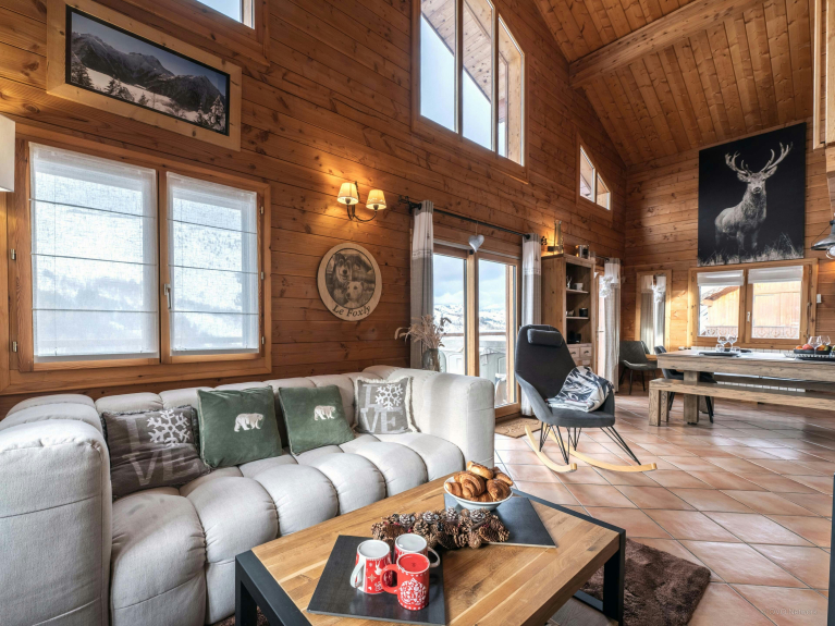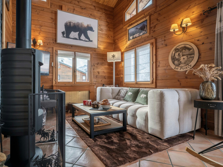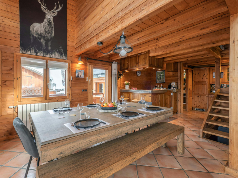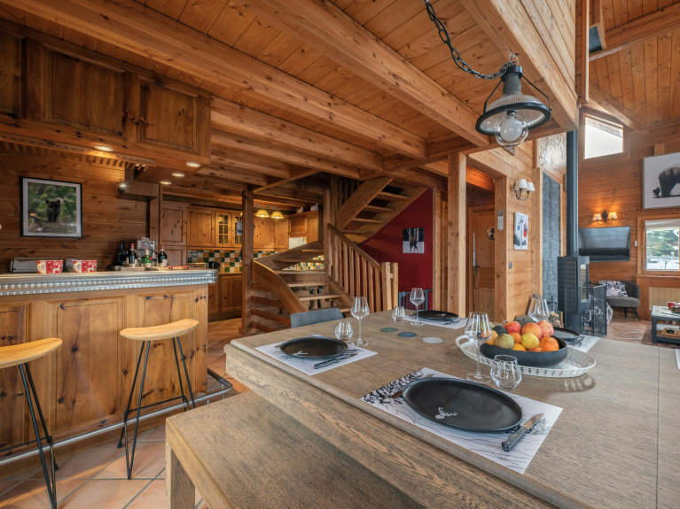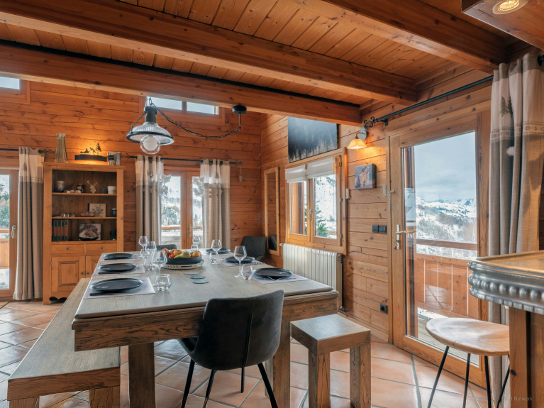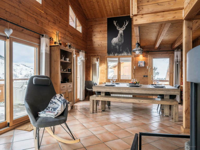 La pièce de vie est l’un des grands atouts du chalet. Son salon, tourné vers un poêle à bois, et son comptoir boisé créent une atmosphère chaleureuse dès le retour des pistes. La terrasse panoramique qui l’enveloppe sur trois côtés permet de se détendre en admirant la vue.