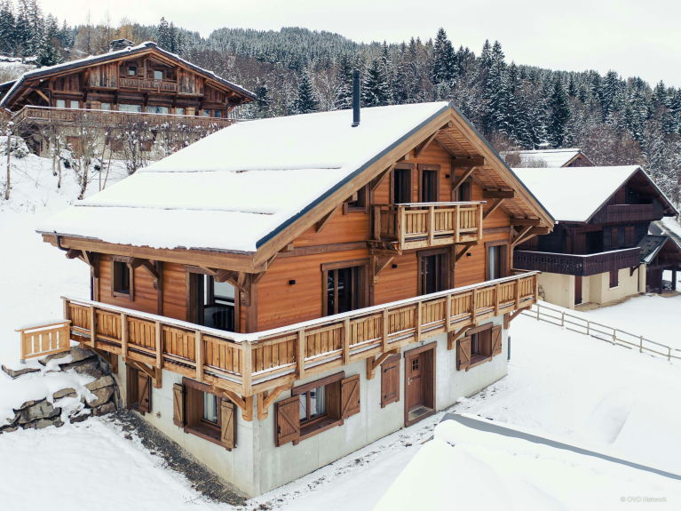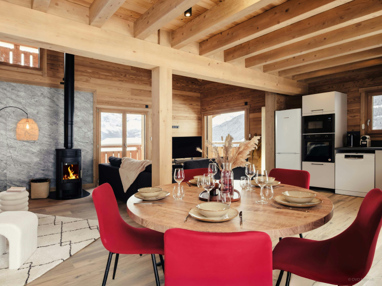 Le cœur du chalet est sa pièce de vie panoramique à l'étage central. Les baies vitrées enveloppent l’espace de lumière, un balcon file sur deux côtés et le poêle à bois réchauffera les soirées d’hiver.