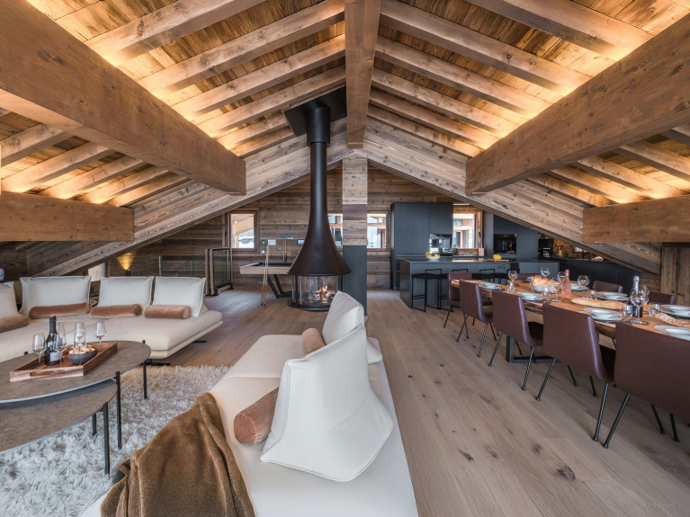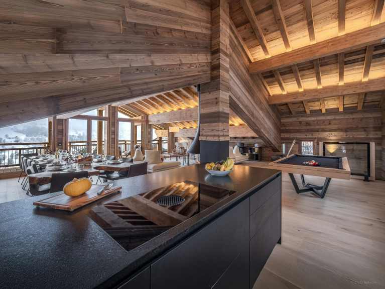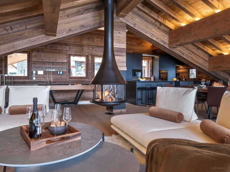 La pièce de vie, réchauffée par une cheminée suspendue, est l’un des atouts du Chalet Celestia. Le salon s’organise autour de larges canapés, propices aux échanges, tandis qu’une table de billard apporte une touche unique. La cuisine contemporaine s’ouvre naturellement sur cet espace, et de larges baies vitrées prolongent les moments partagés vers la terrasse.