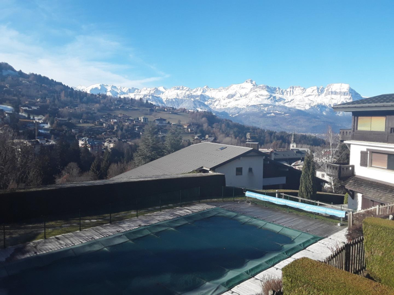 A ST GERVAIS, station thermale , appt 4 à 5 personnes,face à la chaine des aravis, résidence avec piscine et garage prives -Studio-cabine avec baie vitrée,lumineux, dans residence de standing - calme - et spacieux - à proximité du centre ville- des navettes ski-bus et telecabines- gardien-piscine chauffée de mi-juin à mi-septembre, cure thermale, proximité des navettte ski-bus et télécabines -420km de pistes -exposition sud, balcon equipé d' un store et salon de jardin, vue panoramique sur montagne(chaine des Aravis,bettex, mont joux).