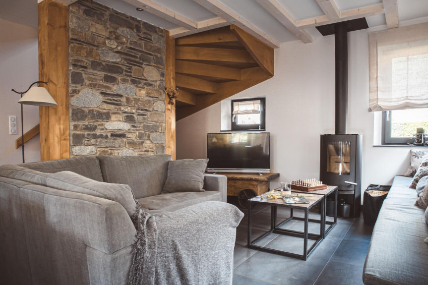 Het woongedeelte bestaat uit een volledig uitgeruste open keuken, een eethoek voor maximaal 10 personen en een gezellige tv-kamer met een houtkachel. De eerste tweepersoonsslaapkamer is ook op de begane grond en heeft een en-suite badkamer met douche. Dit niveau wordt gecompleteerd door een privé sauna, een kleine wasruimte en een toilet.