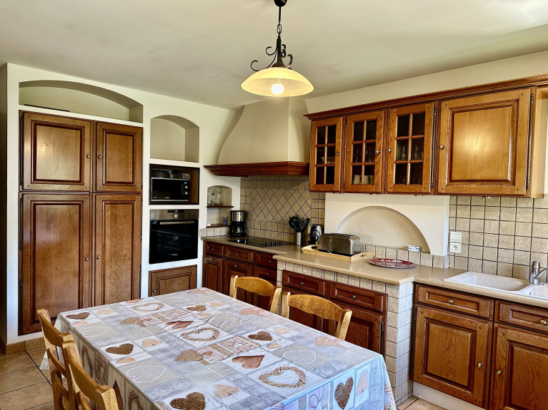 Grote keuken uitkomend op de woonkamer met koelkast, keramische kookplaat, magnetron, pyrolyse oven, afwasmachine.