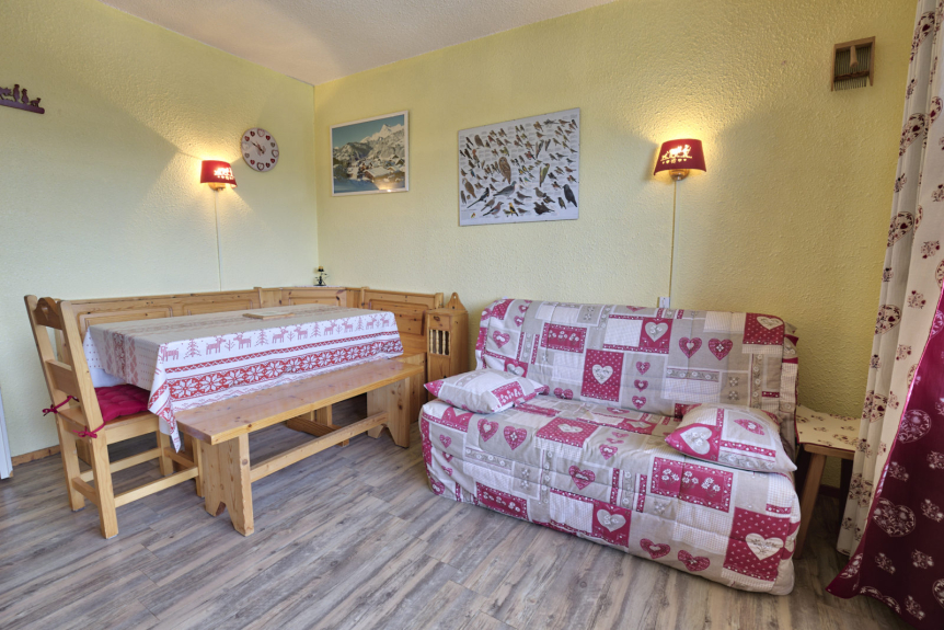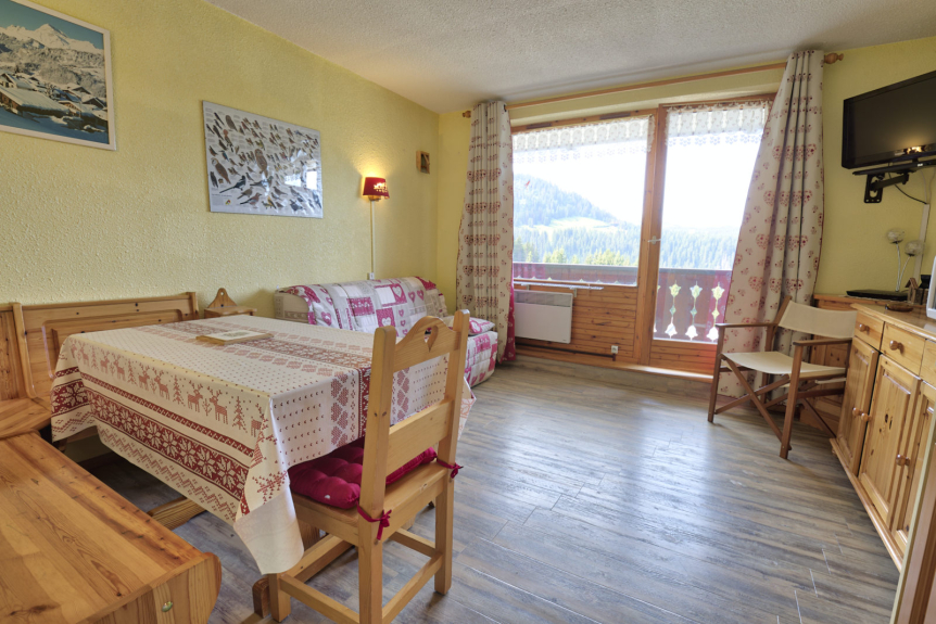 Studio cabine voor vier personen op een hoogte van 1450m, naast de skilift La Boulangère. Met een oppervlakte van 26 m², is het gelegen op de eerste verdieping met een balkon op het zuiden dat een prachtig uitzicht biedt op de Mont Charvin en de vallei.