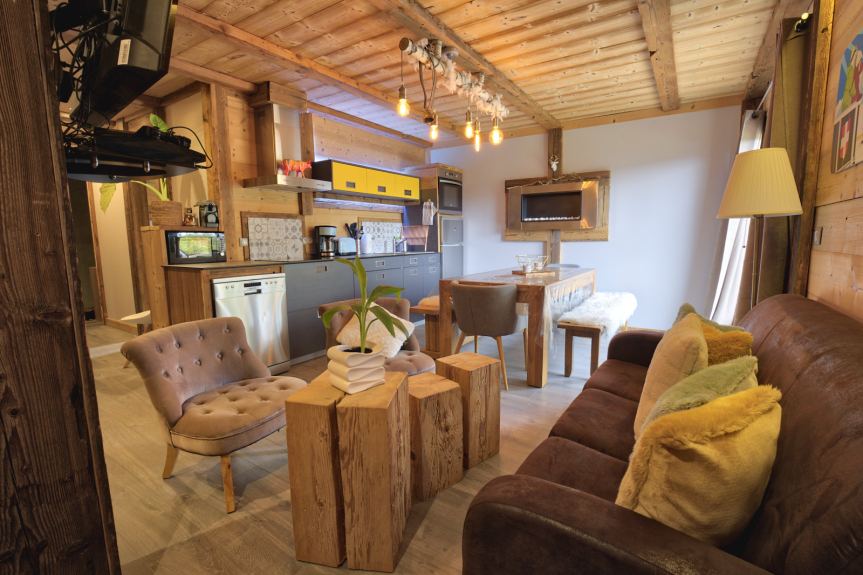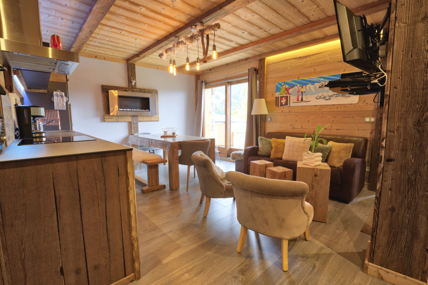 Zeer mooi appartement van 78m² in een bergachtige en moderne stijl, bestaande uit vijf kamers, ideaal voor zes tot acht personen. Op de begane grond zult u genieten van het grote ZUID/WEST terras met STORVATT (Nordic whirlpool), tuintafels en stoelen met uitzicht op de Mont Charvin, de Mont Bisanne en de Chaîne des ARAVIS.