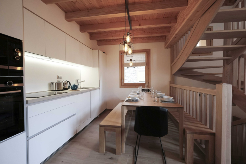 Volledig ingerichte keuken: inductiekookplaat, vaatwasser, oven, magnetron, waterkoker, broodrooster en koffiezetapparaat.