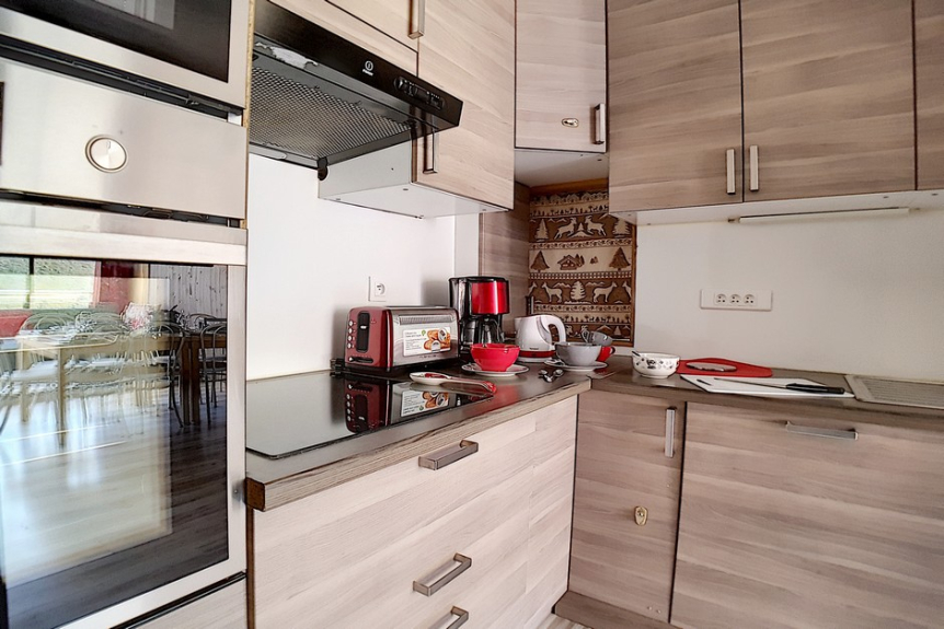 Keuken uitgerust met een grote koelkast, 3 inductie kookplaten, oven, magnetron, afwasmachine, koffiezetapparaat en broodrooster. Raclette en fondue machines.