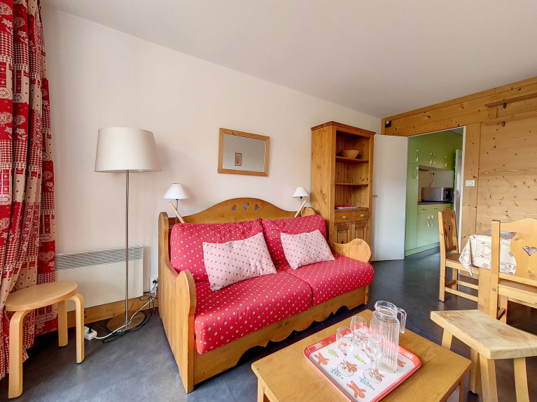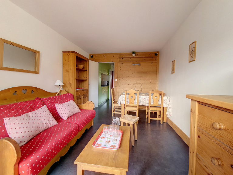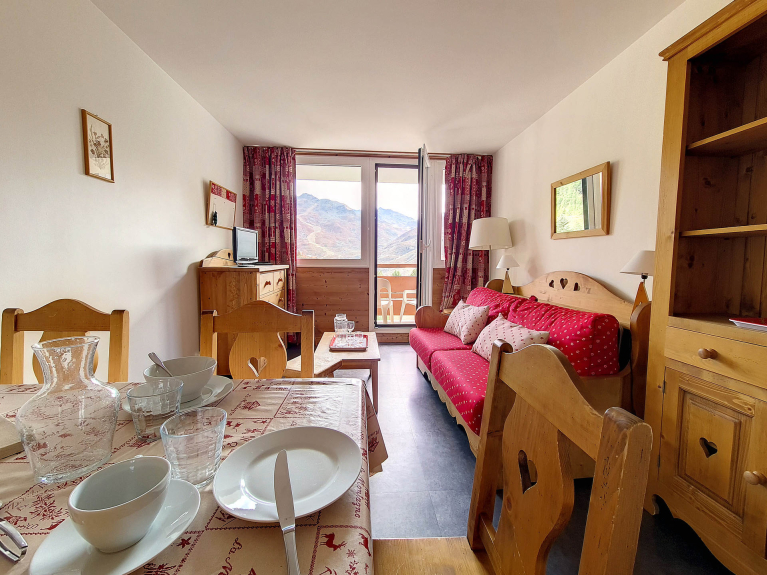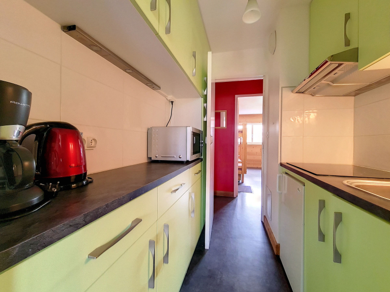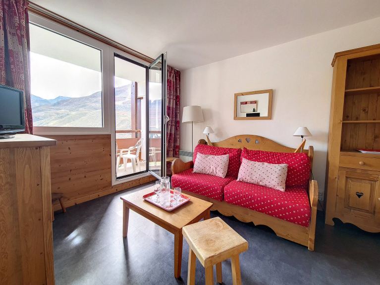 Zeer mooi en volledig gerenoveerd 2 kamer appartement van 36m² voor 6 personen met een balkon op het zuiden, uitzicht op de pistes. Het is gelegen op de 5e verdieping met lift.