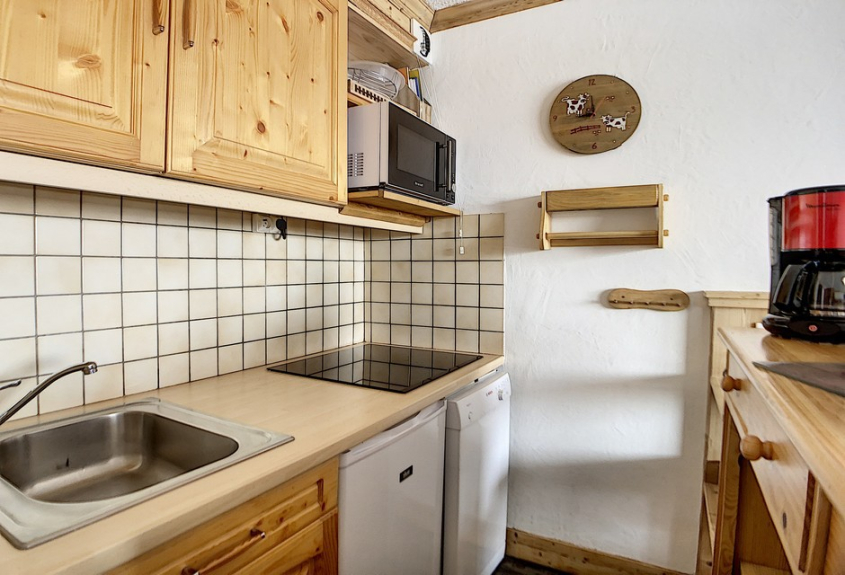 Inbouwkeuken met 4 inductiekookplaten, koelkast, afwasmachine, raclette, fondue, pierrade, combi-oven/magnetron, waterkoker, broodrooster en koffiezetapparaat.