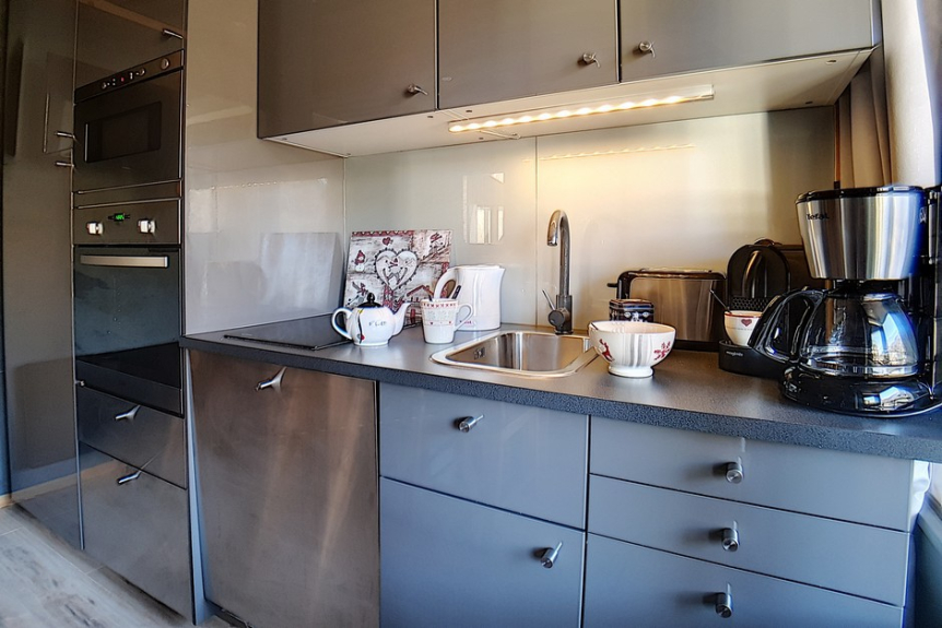 Keuken uitgerust met 2 keramische kookplaten, magnetron, traditionele oven, koelkast, afwasmachine, waterkoker, broodrooster en koffiezetapparaat.