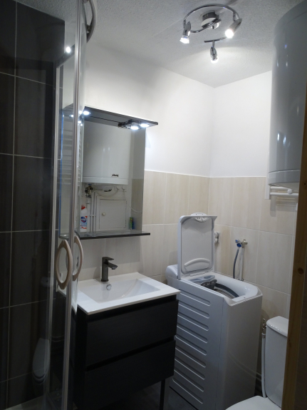 Onlangs gerenoveerde badkamer met douchecabine (90 cm), WC, wasmachine, handdoekdroger, wastafel.