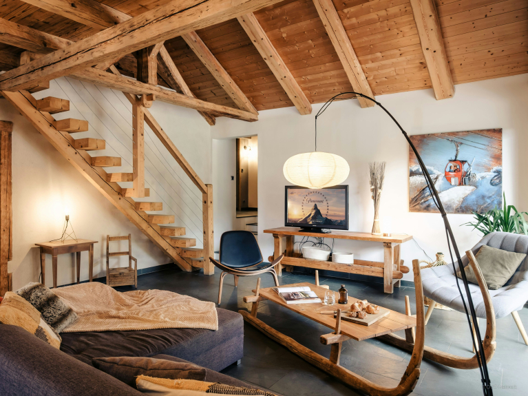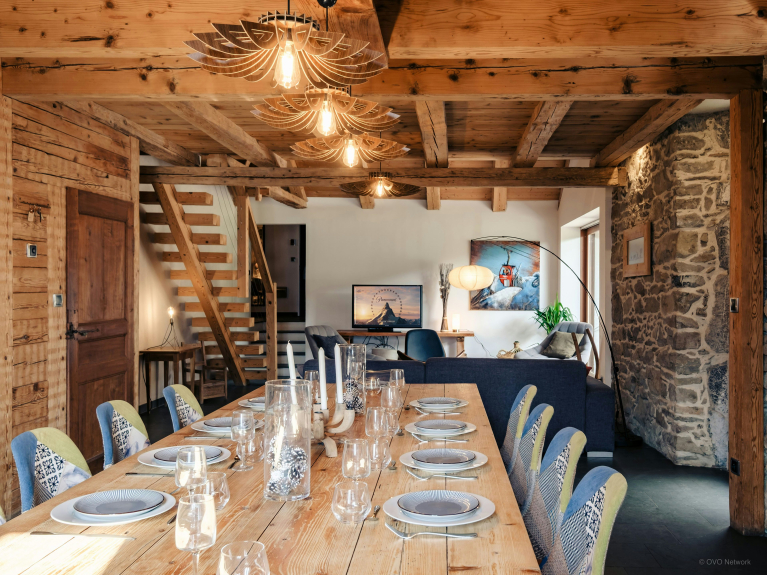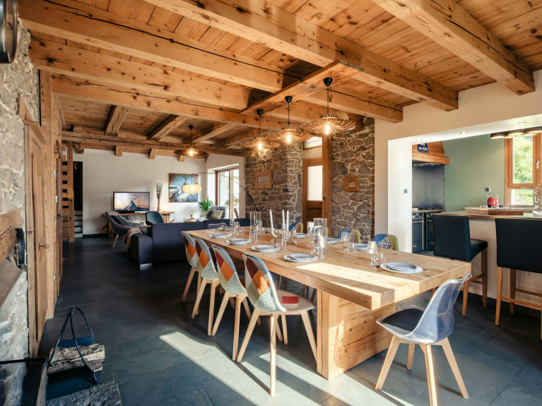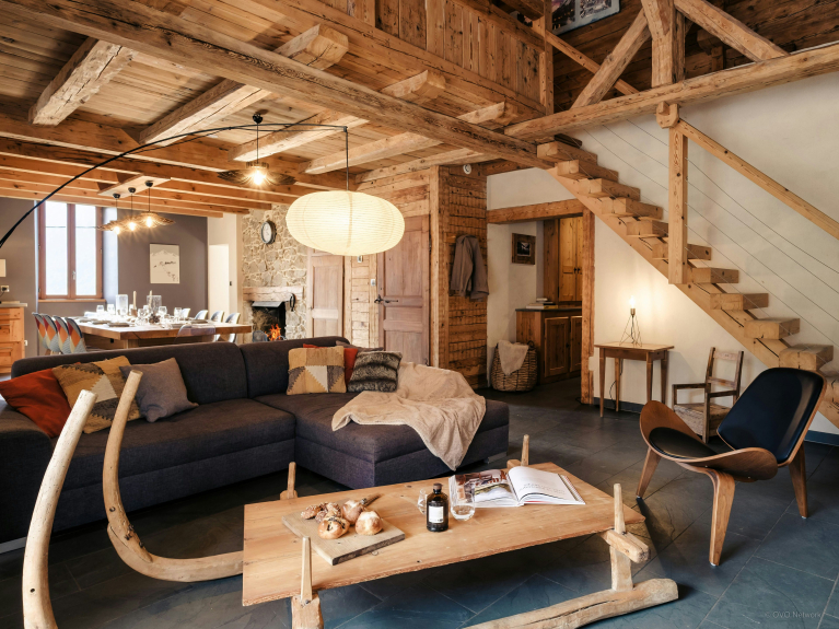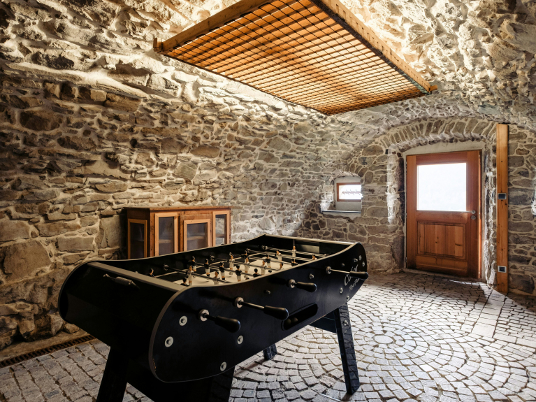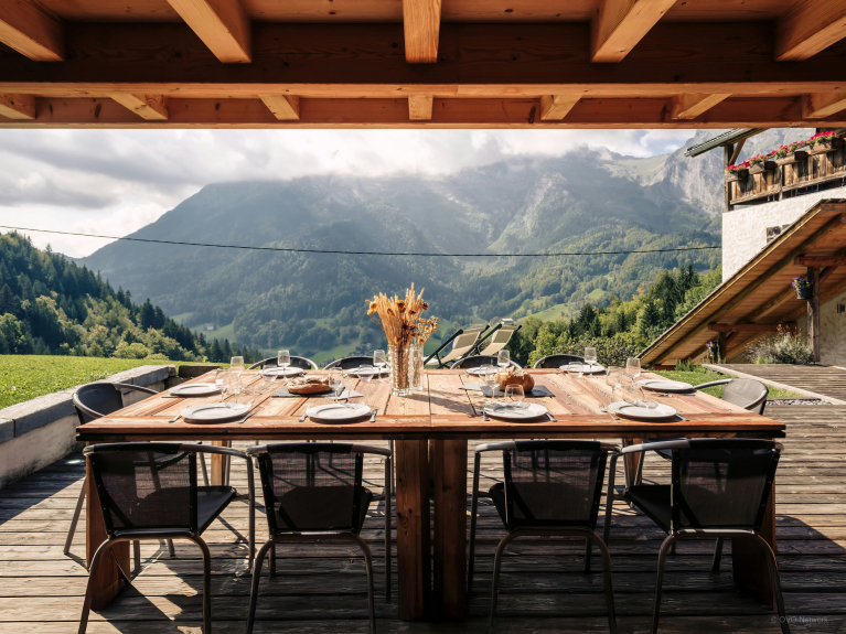 De buitenruimte is een van de hoogtepunten van het pand, met een groot zonnig terras perfect om te ontspannen, waarvan het overdekte deel een 12-persoons eethoek herbergt die het hele jaar door kan worden gebruikt - de perfecte plek om te genieten van een diner op het terras terwijl u de zon achter de bergen ziet ondergaan. De oude kaaskelder onder het chalet is omgebouwd tot skiruimte, waar u al uw materiaal kunt opbergen.