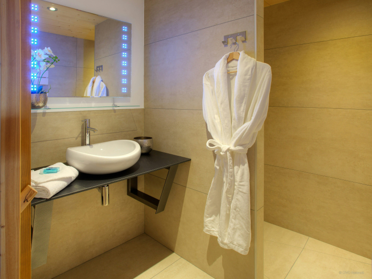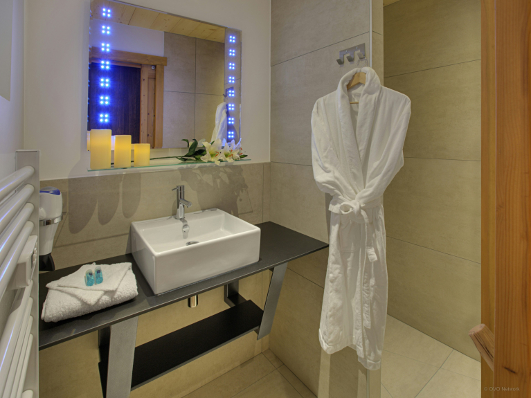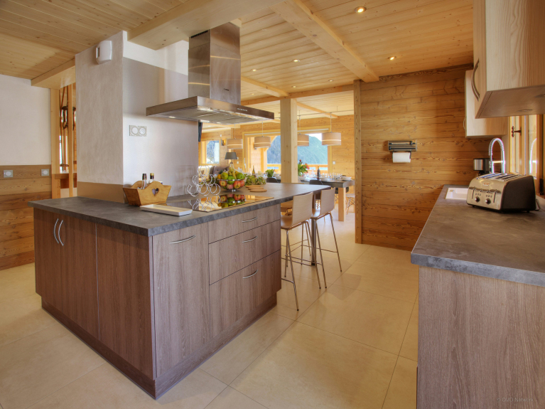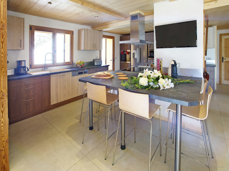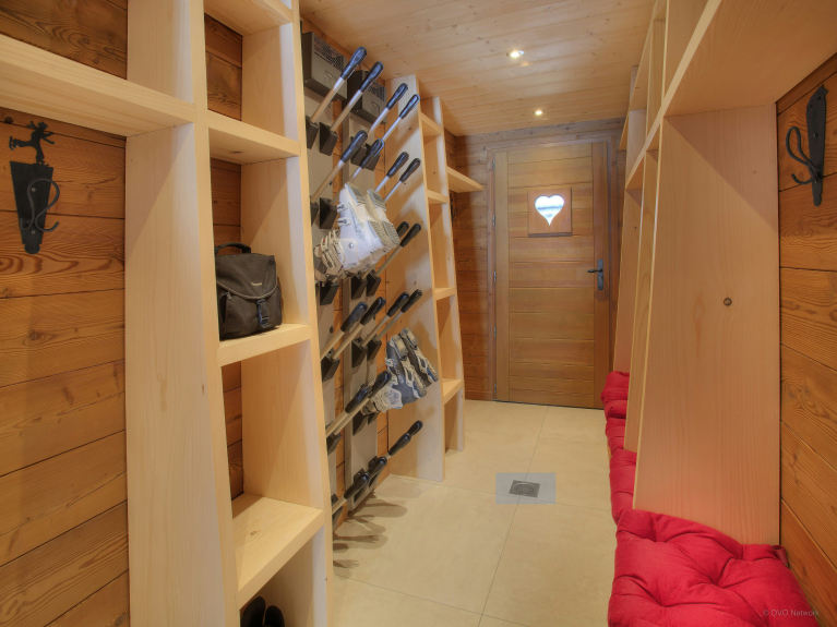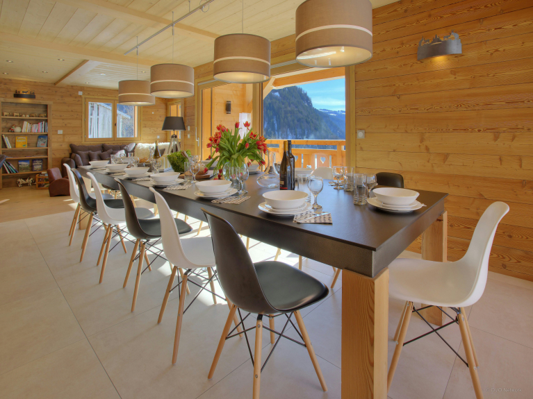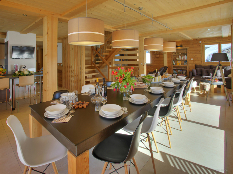 De twee loungeruimtes zijn uitgerust met een bar, een dansvloer en een comfortabele zithoek bij de open haard. De volledig uitgeruste keuken komt uit op de eetkamer, waar alle gasten rond de tafel kunnen zitten. Grote ramen geven uit op het terras. Er is ook een doucheruimte op dit niveau en een apart toilet op elke verdieping. De skiruimte heeft een droger voor schoenen en opbergruimte voor uw uitrusting. Er is een veilige fietsenstalling met oplaadpunten voor elektrische fietsen.