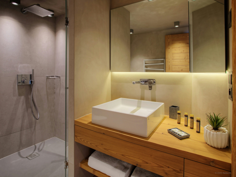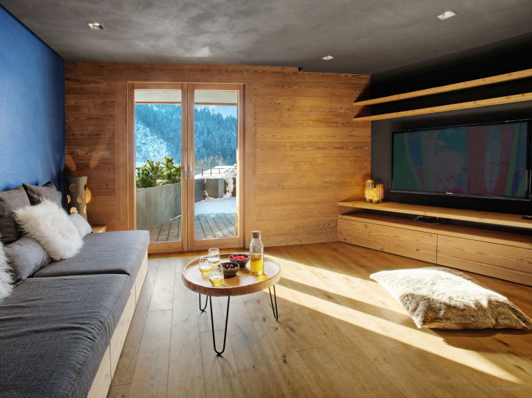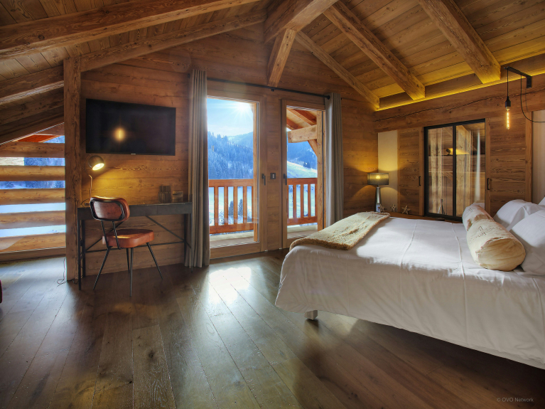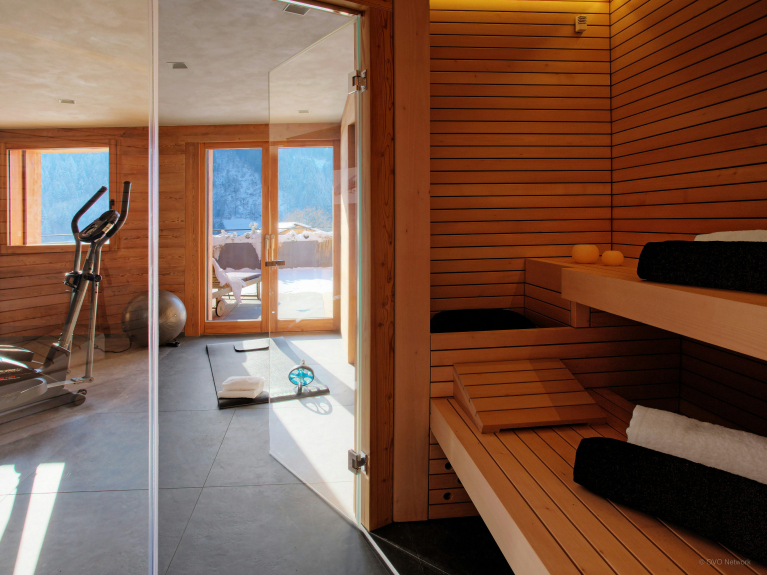 Op de bovenverdieping vindt u een fitnessruimte, een sauna met doucheruimte en bijkeuken, een tweepersoonsslaapkamer met en-suite doucheruimte en een ruime tv-kamer met ingebouwde bank en dubbele deuren naar het eerste terras. Deze zonnige plek is ideaal om te ontspannen in de hot tub, de frisse berglucht in te ademen en te genieten van het uitzicht.