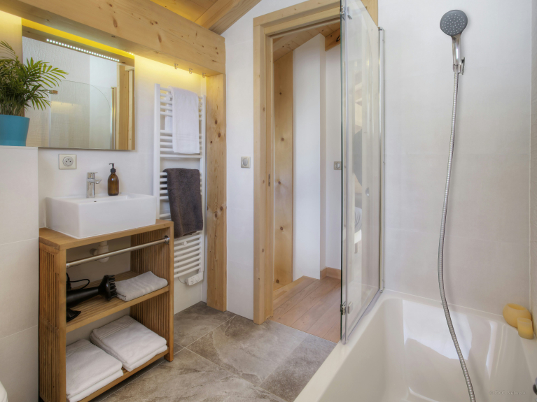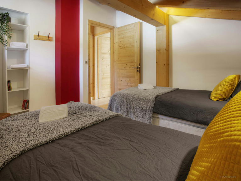 Op de benedenverdieping vindt u een slaapkamer met tweepersoonsbed, een doucheruimte en een apart toilet. Op deze verdieping bevinden zich ook de wasruimte, de speelkamer en de TV-kamer, waar de kinderen zeker graag samen zullen zijn.Nog drie slaapkamers bevinden zich op de eerste verdieping. Een tweepersoonskamer, een kamer met twee eenpersoonsbedden en een kamer met twee eenpersoonsbedden en een stapelbed. Skiërs zullen het erg handig vinden om gebruik te maken van de skiruimte, die buiten bij de voordeur ligt. De overdekte carport is groot genoeg om twee auto's te parkeren.