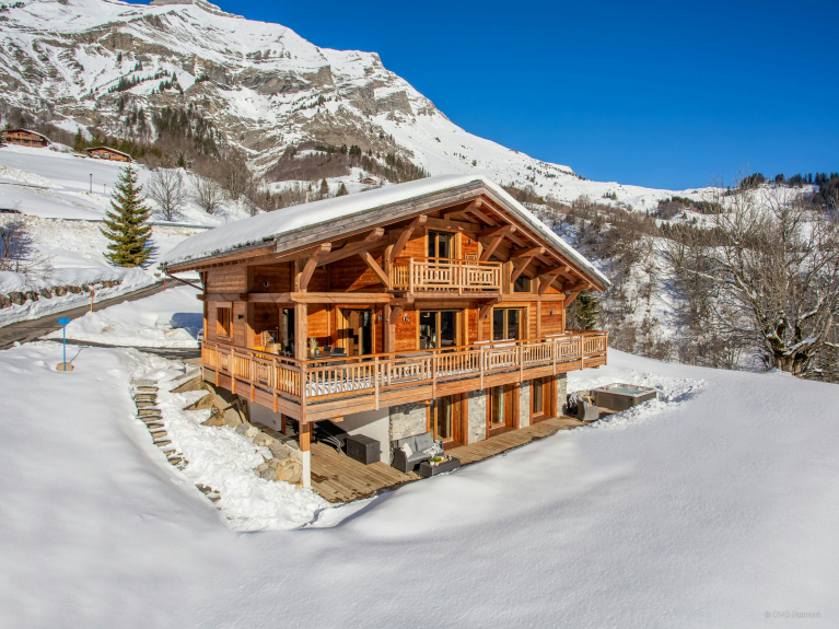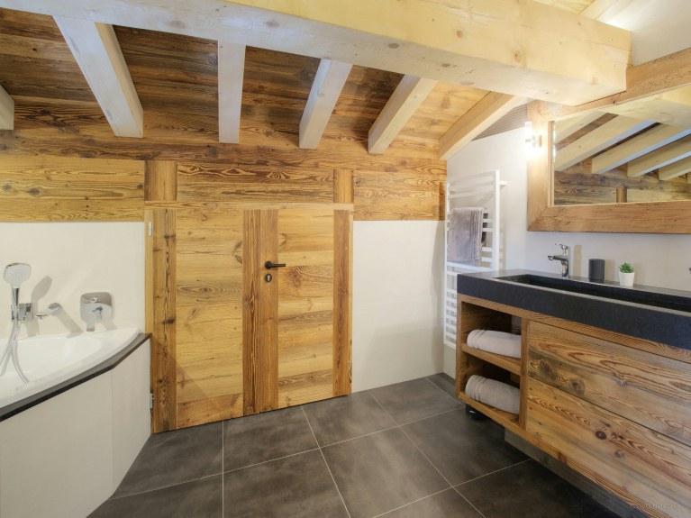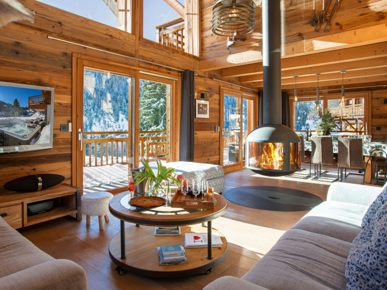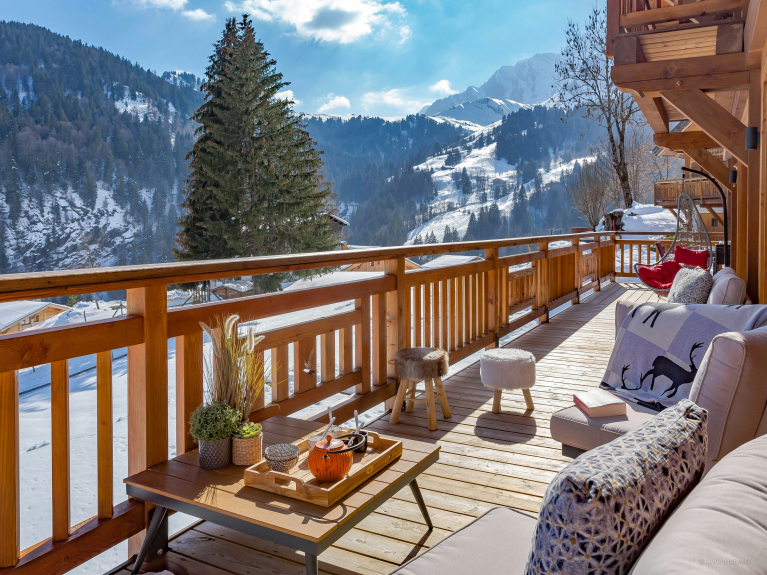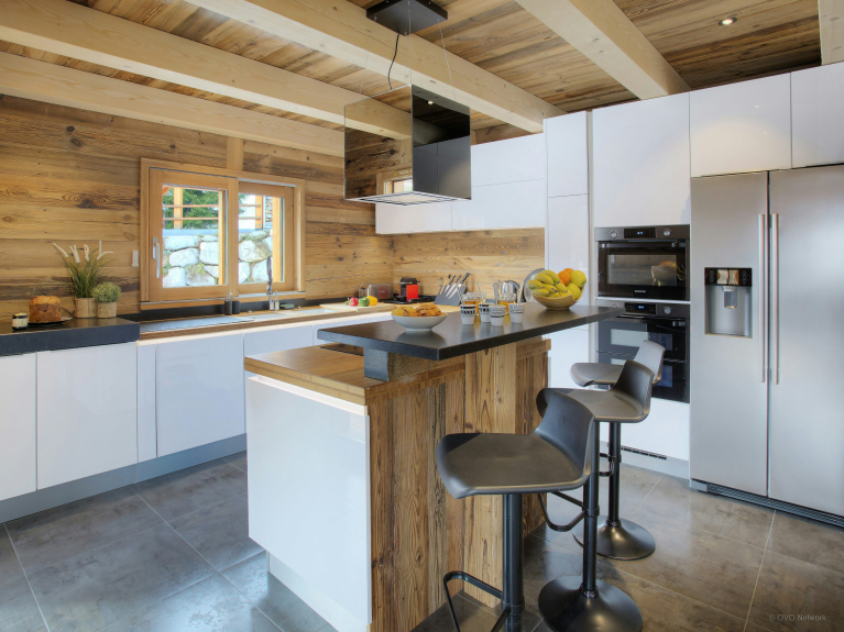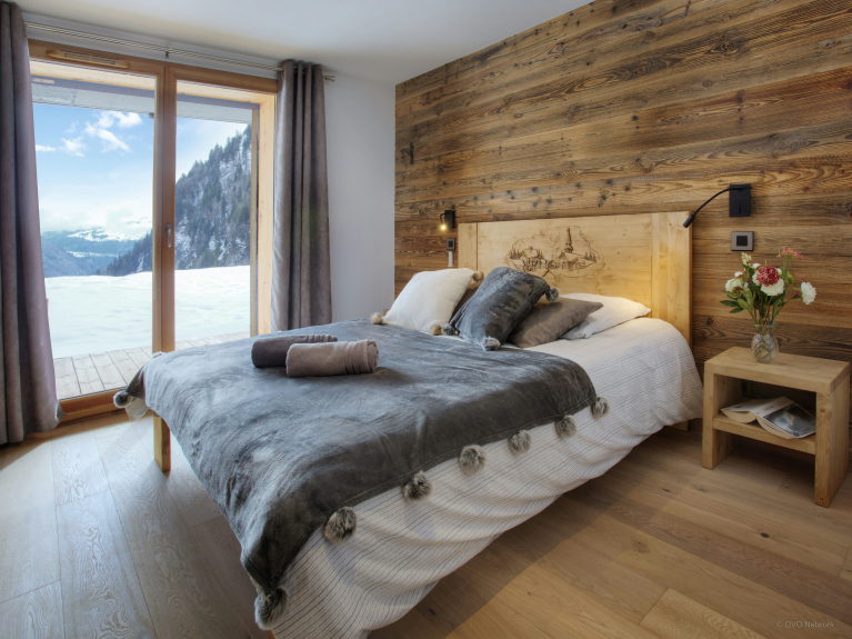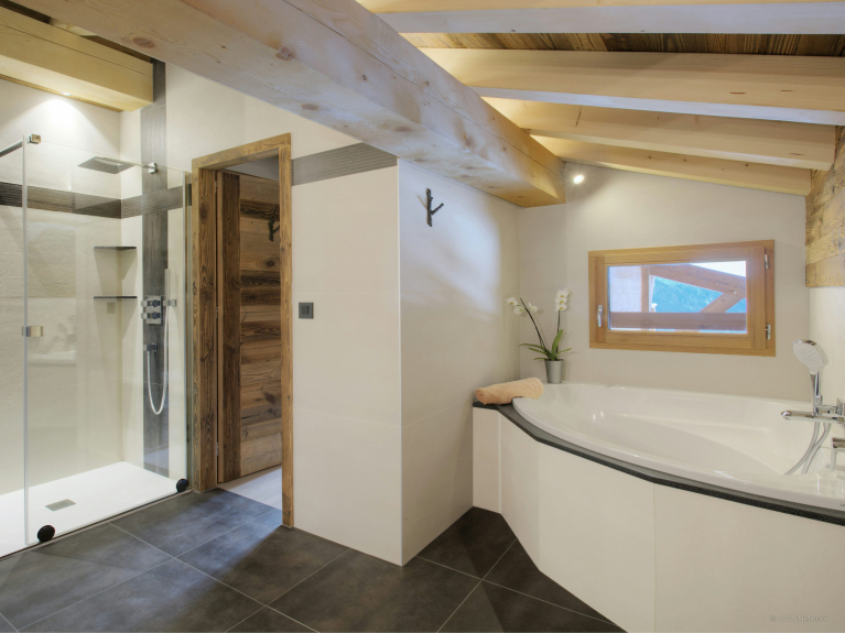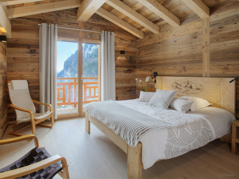 De leefruimte is verdeeld over drie niveaus. De ingang is op de eerste verdieping. U heeft toegang tot de grote dubbele garage, die zeer ruim is voor het stallen van fietsen en ski's, en tot de skiruimte met een verwarmd schoenenrek. Op het eerste niveau is er ook een grote woonkamer met eet- en keukengedeelte. Grote ramen en deuren geven toegang tot het grote, goed belichte balkon dat zich uitstrekt over één zijde en de puntgevel van het chalet. Er is genoeg te eten voor iedereen in de moderne, goed uitgeruste keuken. Er is een grote Amerikaanse koelkast om uw drankjes koud te houden en een bar voor het ontbijt, en de tafel is groot genoeg om samen een maaltijd te delen. En na het diner kunt u ontspannen op de comfortabele sofa's om een film te kijken of een slaapmutsje te drinken aan de bar.4 van de 5 kamers liggen op tuinniveau en hebben toegang tot een terras. Zowel in de zomer als in de winter kunt u 's morgens vroeg de deuren openen om de frisse berglucht binnen te laten; een geweldige manier om de dag te beginnen! Drie van de slaapkamers zijn tweepersoonskamers en de vierde is een kinderkamer, uitgerust met een stapelbed, een eenpersoonsbed en een en-suite badkamer met douche. De vijfde slaapkamer is een ruime suite op de bovenste verdieping. Naast de zeer grote en-suite badkamer heeft deze luxueuze ruimte ook een kleedkamer en een balkon met spectaculair uitzicht. De drie verdiepingen zijn met elkaar verbonden door een zeer elegante trap van hout en glas, waardoor het licht naar binnen stroomt.