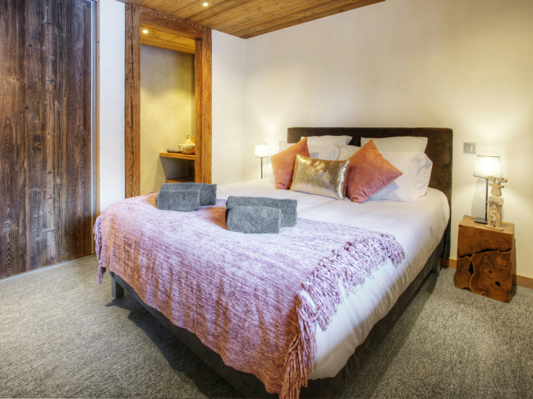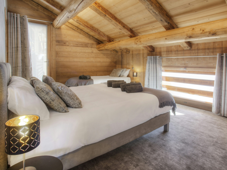 De laatste slaapkamer is op tuinniveau. De laatste slaapkamer bevindt zich op tuinniveau en is geschikt voor twee personen en heeft een en-suite badkamer met douche, TV en directe toegang tot het terras. U kunt de skiruimte direct vanaf het terras of vanuit het chalet betreden.