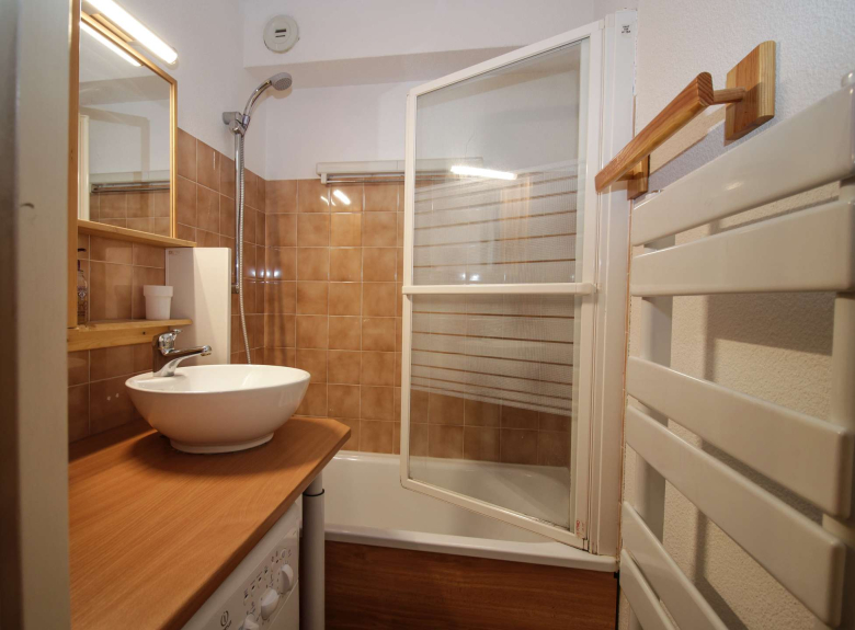 Badkamer : wastafel, bad, wasmachine. Apart toilet.