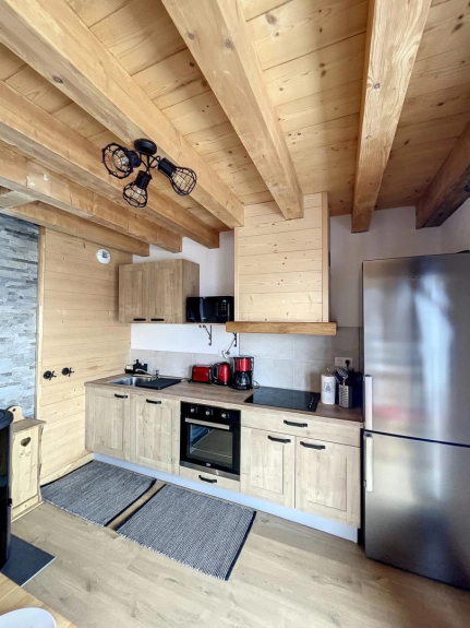 Op de 1e verdieping, de 23m2 woonkamer heeft een volledig uitgeruste keuken open naar de woonkamer en een pelletkachel voor een gezellige sfeer wanneer u terugkomt van het skiën.