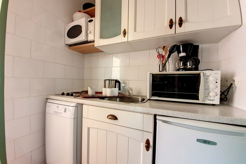 Inbouwkeuken met 2 kookplaten, combi-oven/magnetron, grill-oven, koelkast en afwasmachine, broodrooster, waterkoker en koffiezetapparaat.