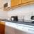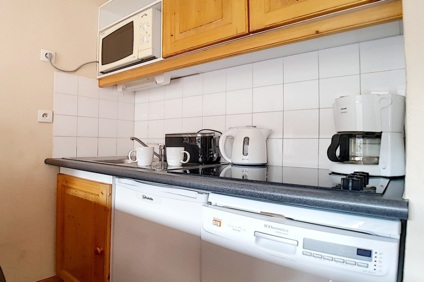 Keuken uitgerust met 4 keramische kookplaten, oven, magnetron, koelkast, afwasmachine, waterkoker, koffiezetapparaat en broodrooster.