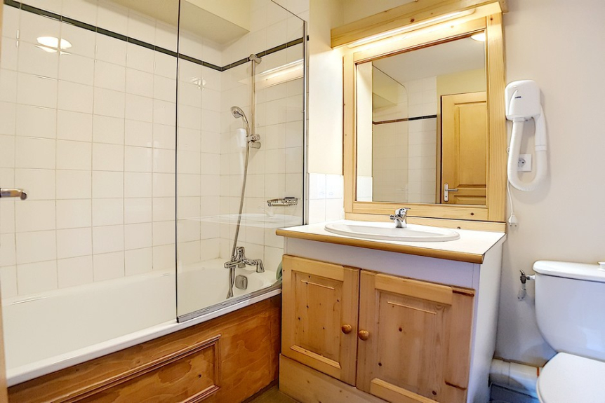 Badkamer met bad, wandhaardroger en WC.