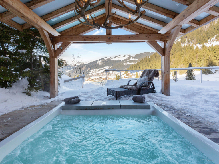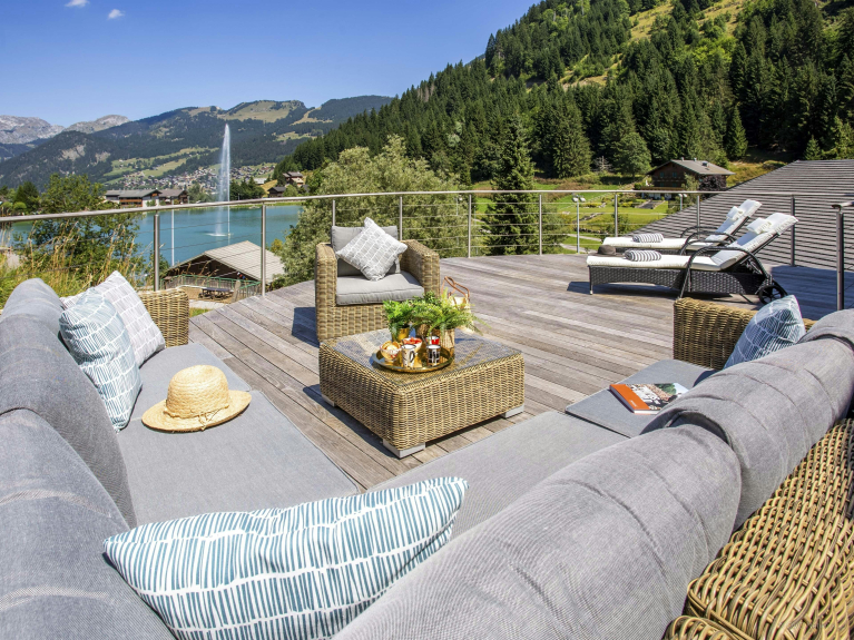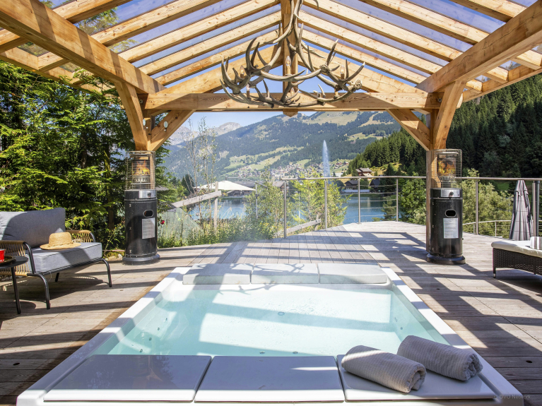 Dit gerenoveerde chalet, gebouwd in de jaren 90 op een berghelling, kijkt uit over het meer, de bergen en de skiliften. Vanaf het terras kunt u uitkijken over het landschap. De tuin is aangelegd op verschillende niveaus en omvat een pergola met een jacuzzi.