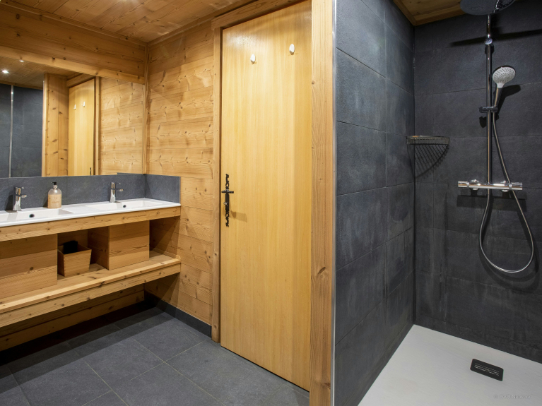 Het chalet heeft drie badkamers, maar slechts één slaapkamer heeft een eigen badkamer. Een van de badkamers is een verlengstuk van de woonkamer en komt uit op het terras met jacuzzi. Dit is een geweldige plek om je af te spoelen voordat je in het bubbelbad stapt.