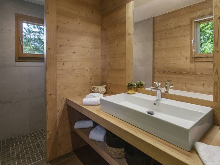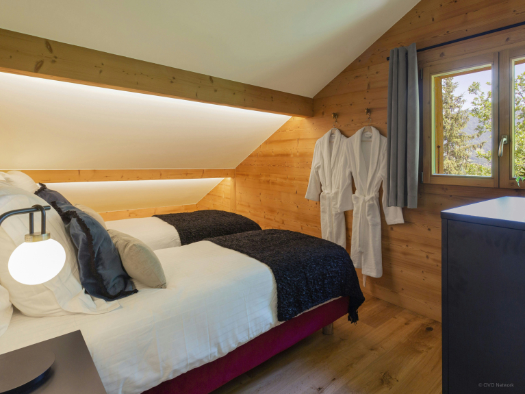 Op de zolder vindt u twee slaapkamers. Eén heeft een kingsize bed en een balkon. Zet de deuren wijd open en nip aan uw koffie in de vroege ochtend terwijl u de frisse berglucht inademt. De tweede slaapkamer kan worden ingericht als een kingsize bed of twee aparte bedden. Beide slaapkamers delen een doucheruimte. De derde slaapkamer, gelegen op de eerste verdieping, heeft een kingsize bed dat kan worden veranderd in twee aparte bedden. Het heeft een eigen en-suite badkamer met douche.