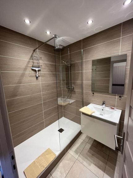 Badkamer met douche, wastafel en WC
