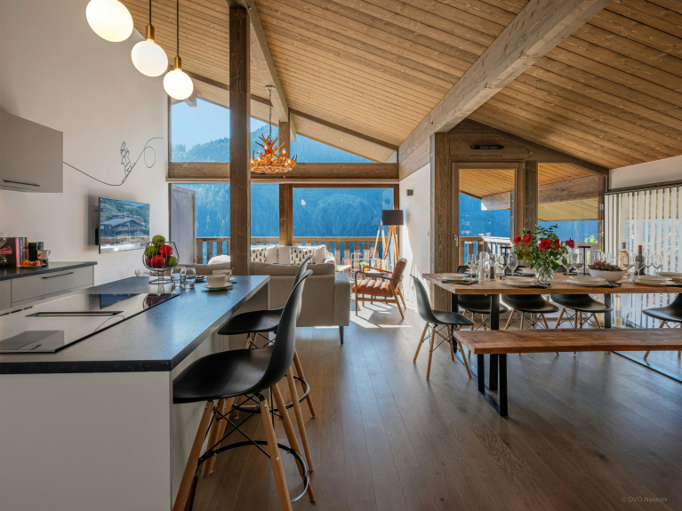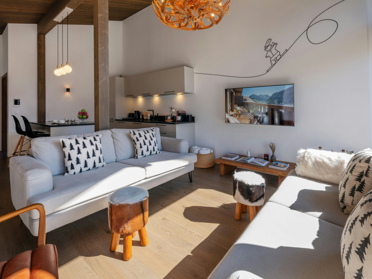 De zeer ruime woonkamer op de bovenste verdieping is bijzonder aangenaam. Het heeft veel natuurlijk licht en een prachtig uitzicht op het dorp en de omliggende bergen. Het opent ook naar een charmant balkon, dat veel gezellige momenten van ontspanning belooft aan het eind van de dag.