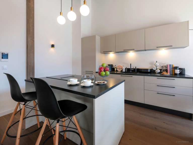 Het woongedeelte bestaat uit een zithoek, een ruime eettafel en een moderne, open keuken.