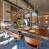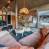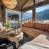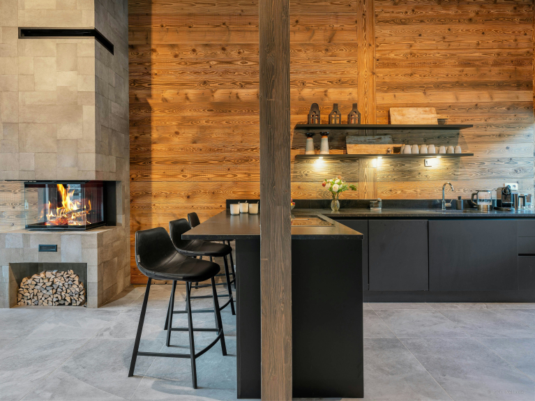 Grote openslaande deuren baden de kamer in natuurlijk licht, en een centrale open haard zorgt voor een gezellige sfeer in de winter. De moderne keuken bevindt zich aan de achterzijde, gescheiden van de woonkamer door een eenvoudig aanrecht.