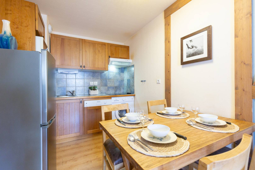 De volledig uitgeruste keuken komt uit op de woonkamer (keramische kookplaat, magnetron, vaatwasser, wasmachine, koelkast/vriezer).