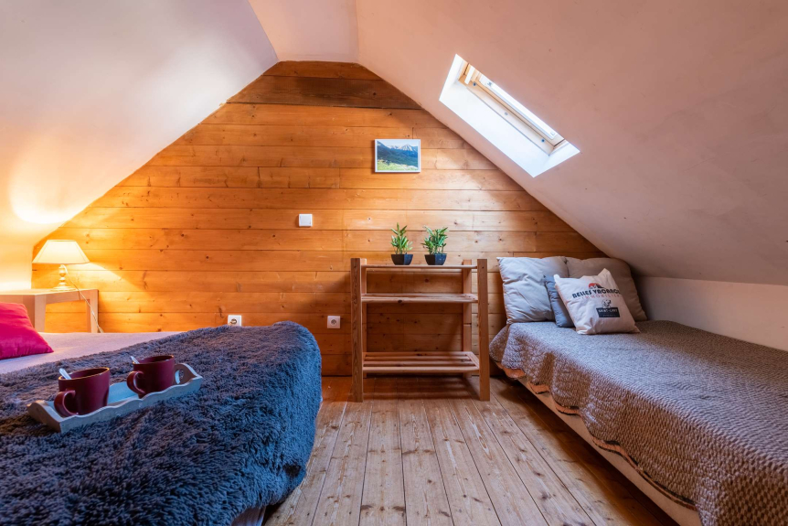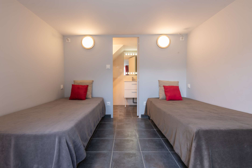 In het 2e deel, boven, vind je een studio met een tweepersoonsbed, een minikeukentje en een badkamer. Op de begane grond is een slaapkamer met twee eenpersoonsbedden en een eigen badkamer!