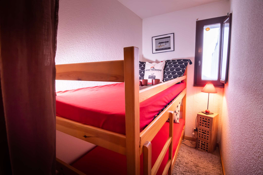 1 slaapkamer met een tweepersoonsbed (140cm) en een cabine met 2 eenpersoons stapelbedden,