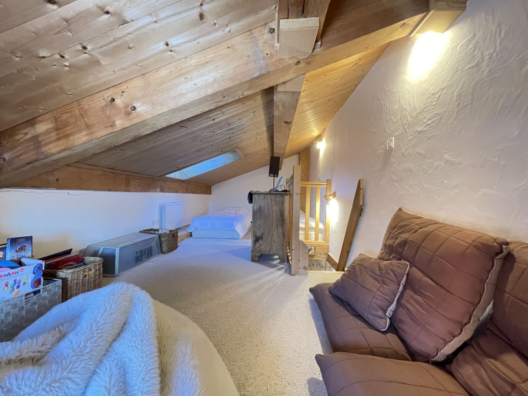 - Mezzanine met televisie, speelhoek en slaaphoek met twee kinderbedden.