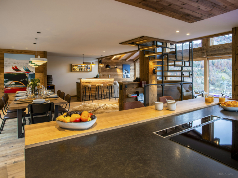 Het woongedeelte is zorgvuldig ontworpen om een adembenemend uitzicht te bieden, of je nu in de woonkamer zit, aan de eettafel of een maaltijd bereidt in de volledig uitgeruste keuken. Bovendien is er een indrukwekkend panoramisch terras waar je samen kunt eten en genieten van de frisse Alpenlucht.