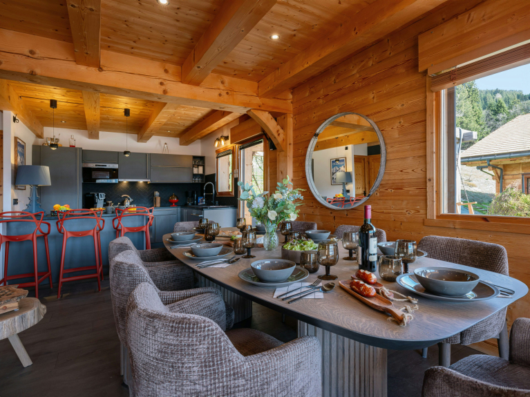 De inrichting van Chalet Sivara is warm en gastvrij, en de unieke verlichting, op maat gemaakte meubels en verzamelobjecten geven het een vleugje originaliteit, zoals bijvoorbeeld blijkt uit het opvallende tv-meubel. Het bereiden van lekker eten is een waar genoegen in de volledig uitgeruste keuken en de comfortabele fauteuils aan de eettafel beloven lange momenten van gezelligheid. De aangrenzende lounge, met zijn houtkachel, is bijzonder gezellig.