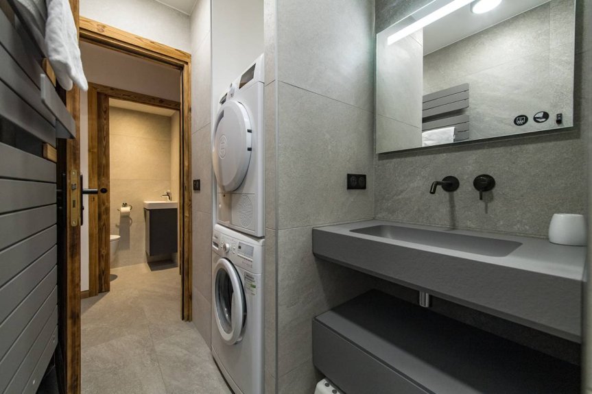 Een doucheruimte met wasmachine en apart toilet maken dit appartement compleet.
