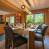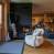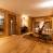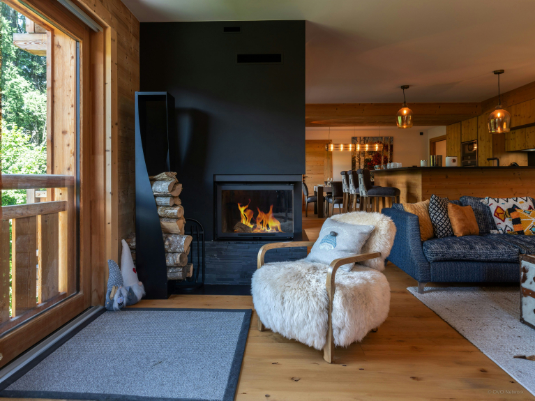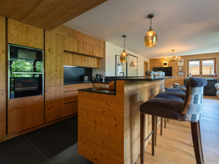 De comfortabele woonkamer heeft een grote bank en fauteuils van imitatiebont, gerangschikt rond een open haard en tv. De open keuken is zeer goed uitgerust, met een centraal aanrecht en een grote eettafel. Deze kamer komt uit op een overdekt en gemeubileerd balkon, dat in de winter verwarmd kan worden met een gasbrander.