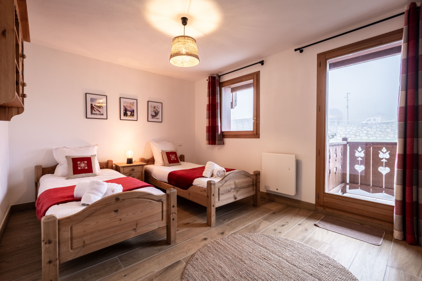 Een slaapkamer met 2 aparte bedden (90cm), eigen badkamer met toilet en toegang tot het balkon.