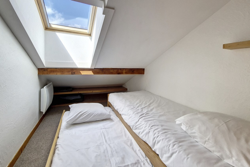 Gesloten slaapkamer: een eenpersoonsbed en een uitschuifbaar bed (vloerbedekking)