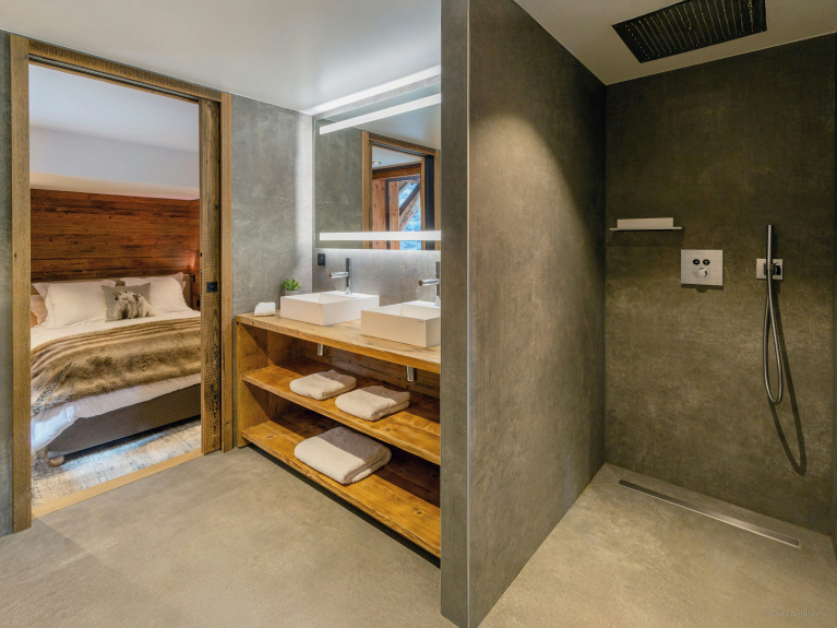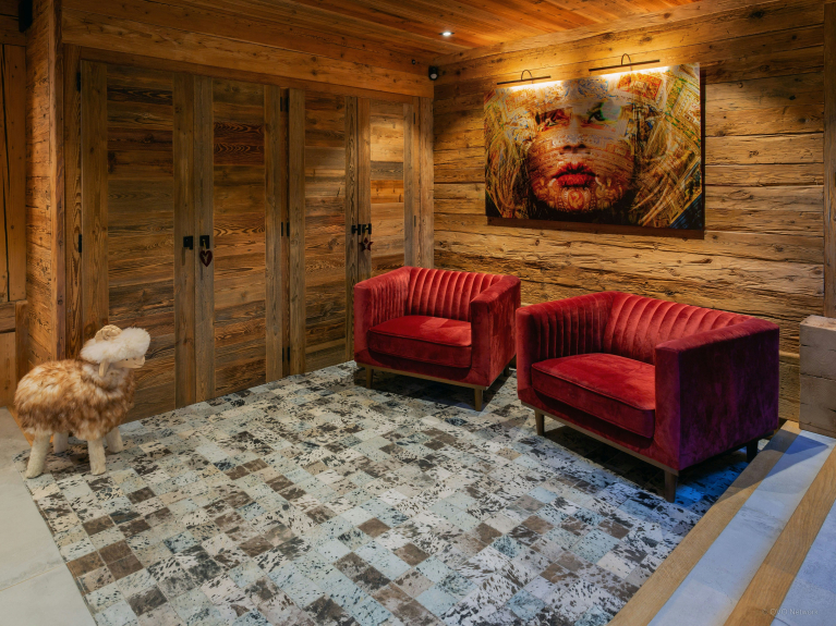 In de ruime woonkamer kunt u optimaal genieten van het landschap dankzij de erkers die uitkomen op twee verwarmde balkons. Een centrale open haard scheidt de eetkamer van de woonkamer, en de volledig uitgeruste keuken is voorzien van apparatuur van topklasse, zoals een grote Amerikaanse koelkast. Voor een aperitiefje kunt u terecht in de bar.