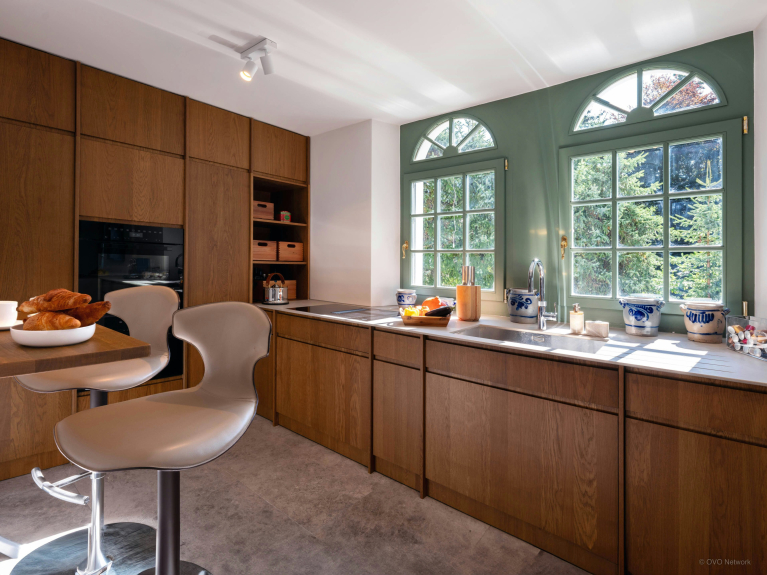 De begane grond heeft een volledig uitgeruste keuken, een grote eettafel en een stijlvolle woonkamer met bank in een torentje. Mooie oude Franse ramen komen uit op een gemeubileerd balkon.
