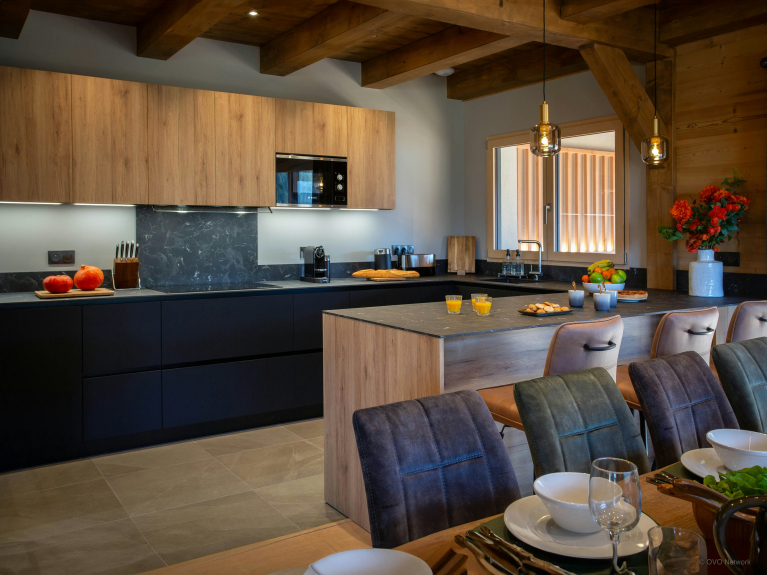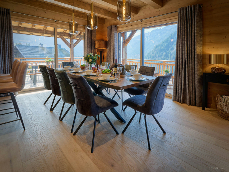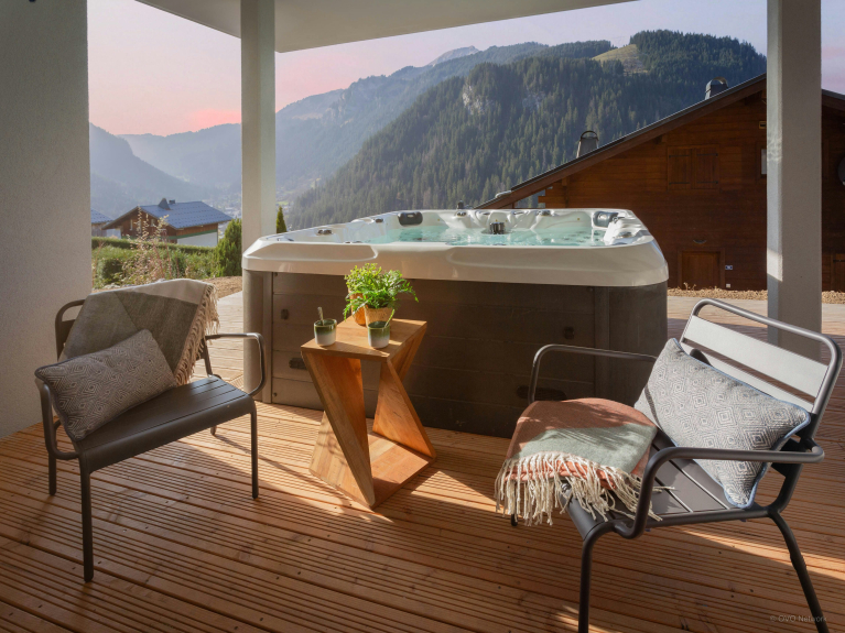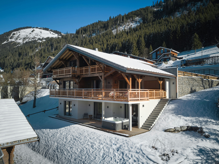 Chalet La Cachette heeft geen tuin, maar de grote aangelegde terrassen, zonnige balkons en dubbele garage zijn een echte luxe voor een woning zo dicht bij het centrum van het resort.