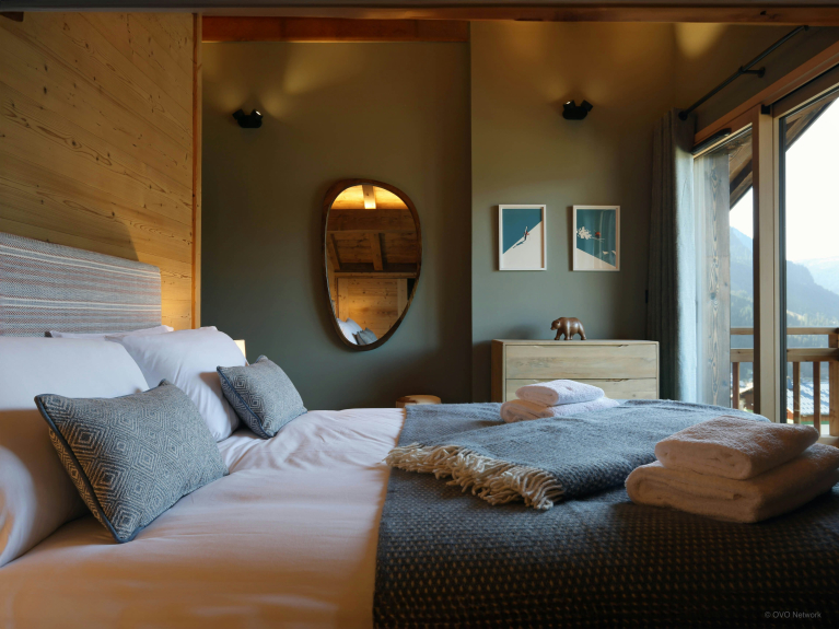 Drie van de vijf slaapkamers van het chalet bevinden zich op tuinniveau en kunnen worden ingericht met een tweepersoonsbed of twee eenpersoonsbedden. Ze komen allemaal uit op een zonnig terras met een jacuzzi. De twee extra slaapkamers op de bovenverdieping hebben elk een eigen doucheruimte en directe toegang tot een balkon.