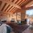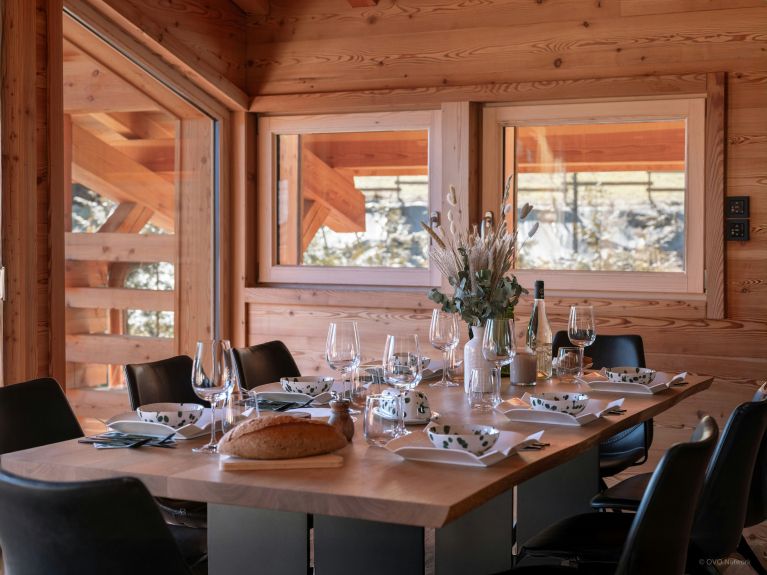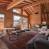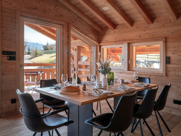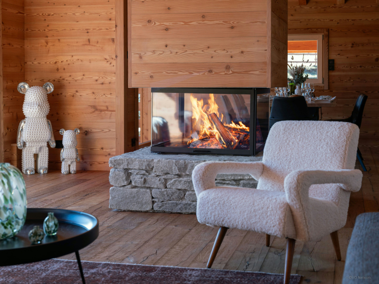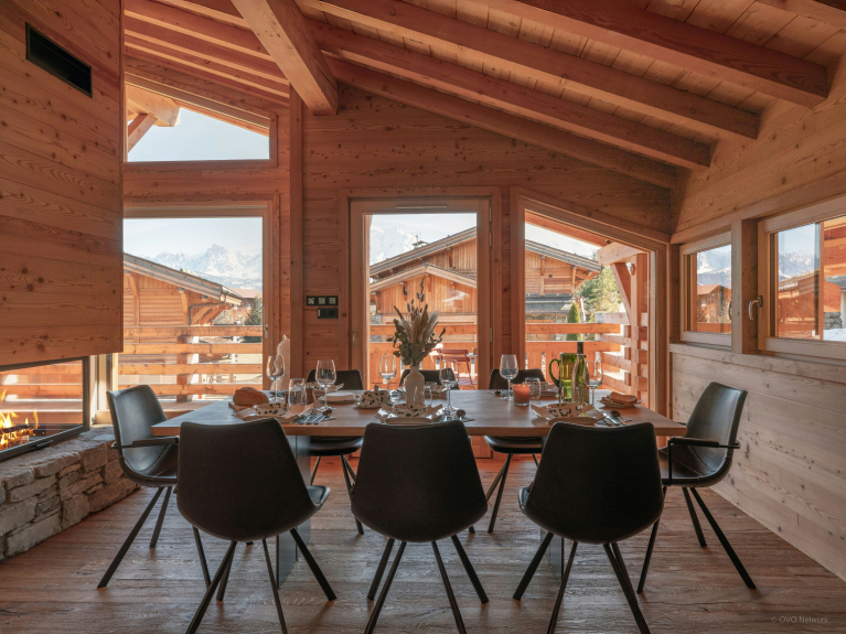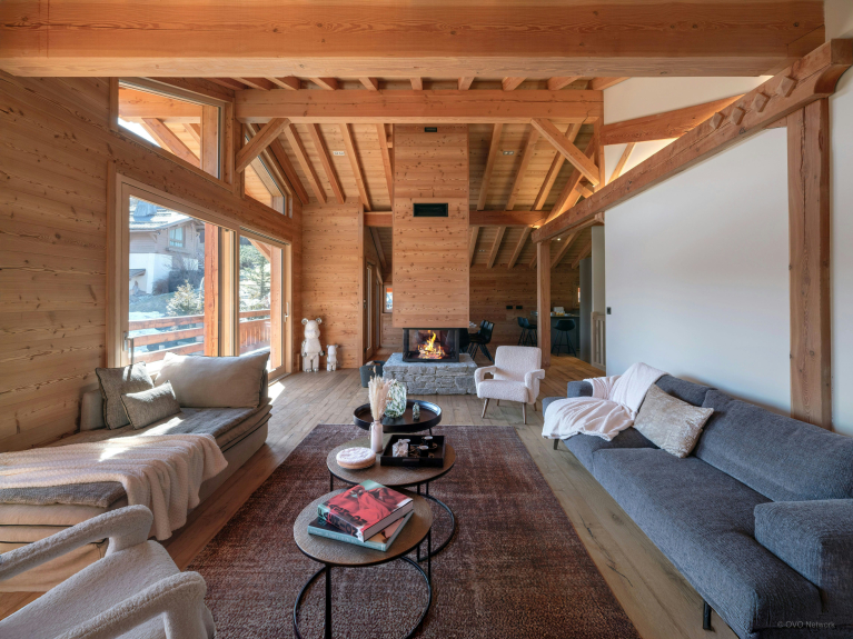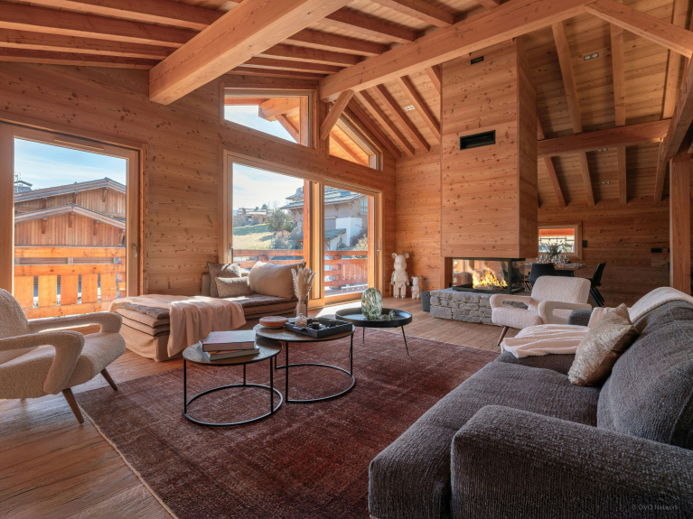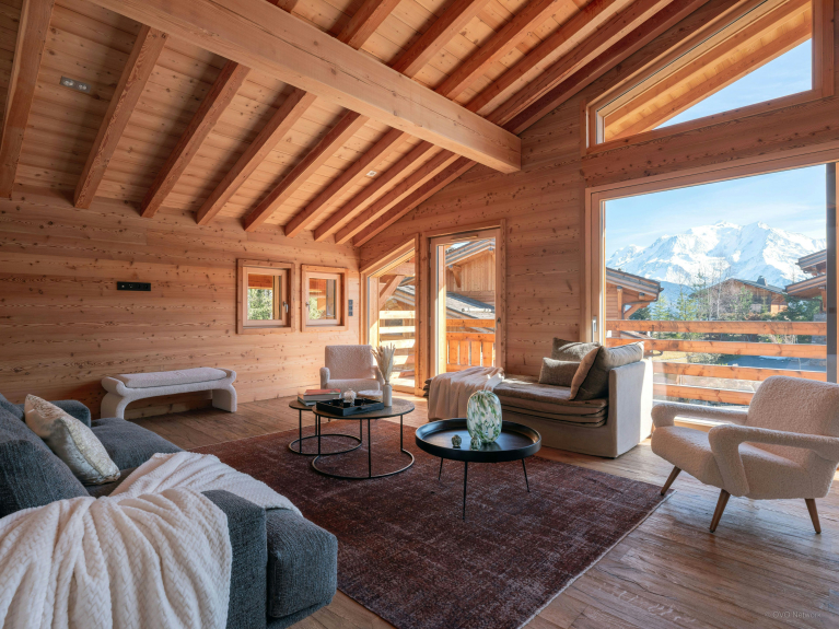 De ruime woonkamer op de bovenste verdieping is bijzonder gastvrij, met comfortabele fauteuils en banken, een centrale open haard en veel natuurlijk licht. Grote ramen openen naar een balkon met uitzicht op het Mont Blanc-massief.