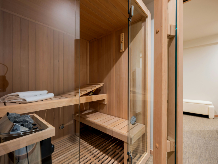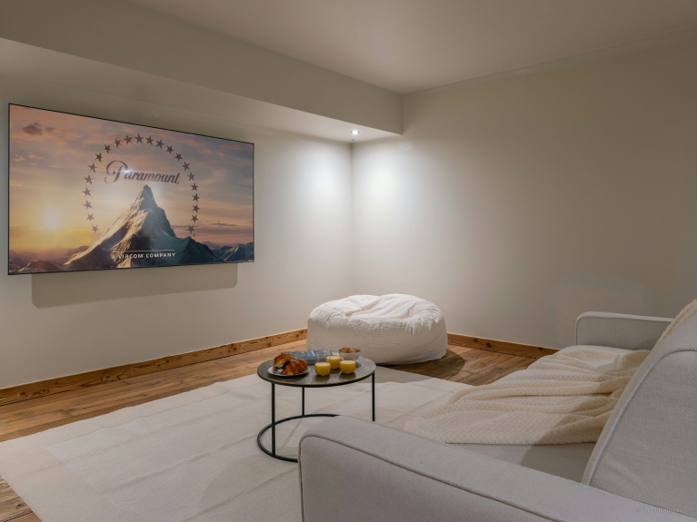 Er is geen televisie in de woonkamer, maar op het tuinniveau is een comfortabele bioscoopzaal ingericht. Op dit niveau bevindt zich ook de wellnessruimte, met een sauna en stoombad om te ontspannen aan het eind van de dag, evenals een functionele skiruimte en een wasruimte met wasmachine en droger.