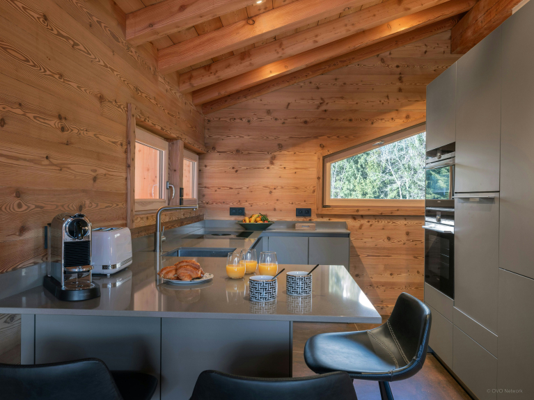 De moderne keuken heeft veel voorbereidingsruimte, een dubbele oven die geweldig is voor grote groepen, en een aanrecht waar je kunt samenkomen voor een kopje koffie.
