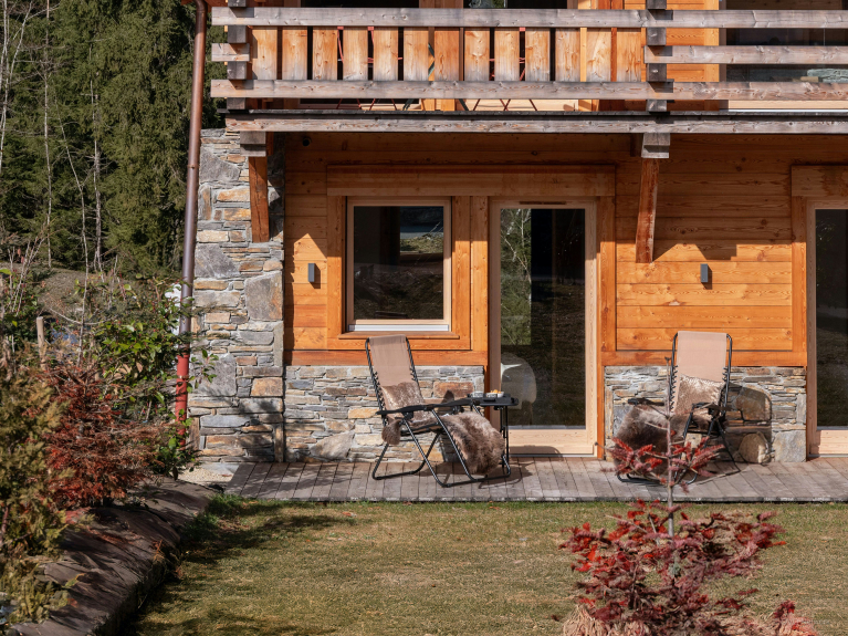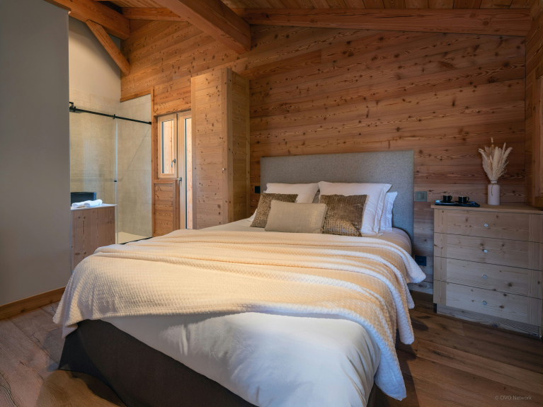 Vier van de vijf slaapkamers op de drie verdiepingen hebben een eigen badkamer met douche. De drie kamers op de middelste verdieping hebben ook toegang tot een houten terras. De laatste kamer, een heerlijke slaapzaal voor zes personen op tuinniveau - met een tweepersoonsbed en twee stapelbedden - is via een gang verbonden met een doucheruimte en een apart toilet. Voor je gemak heeft elke verdieping van het chalet zijn eigen toilet.